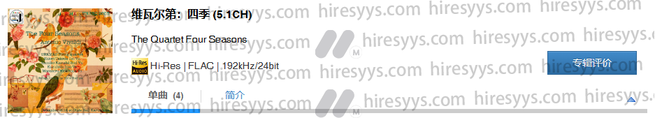 因爵士乐录音闻名的UNAMAS唱片公司首次挑战古典音乐。 2014年,大雪的轻井泽·大贺音乐厅。以小提琴演奏家竹田诗织为首,4名青年演奏家组成四重奏乐团,演奏了维瓦尔第(Vivaldi)最为著名的弦乐四重奏作品《四季》。乐团成员们分别录制了每个季节为代表的乐章中的独奏部分,各自带来了对经典的全新诠释。其中春季为第二小提琴独奏,夏季为大提琴独奏,秋季为中提琴独奏,冬季为第一小提琴独奏。如此充满活力的“四季”,可谓至今未见。 利用最新科技,完全执着于高解析度录音,给听众带来无与伦比的速度感和重量感,让人意想不到这竟是弦乐四重奏。192kHz/24bit 清晰地捕捉到了4种乐器制造的细微装饰音。双声道欣赏起来已经极为出色,可能的话,推荐五声道。现场录音采用的麦克风朝上设置,收录了从舞台天花板倾泻流淌的反射音。这是迄今为止保守的古典音乐录音中从未应用过的手法。通过这种颠覆常识的做法,将不断开拓和扩展全新的Hi-Res音乐世界。
